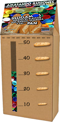 Para que tengais una idea de las cantidades de tapones que son necesarios para conseguir barras de pan, os informamos que 1 Kg de tapones de plástico equivale a 10 barras de pan, y que 1 caja normal de folios llena de tapones equivale aproximadamente a 1,5 Kg = 15 barras de pan.